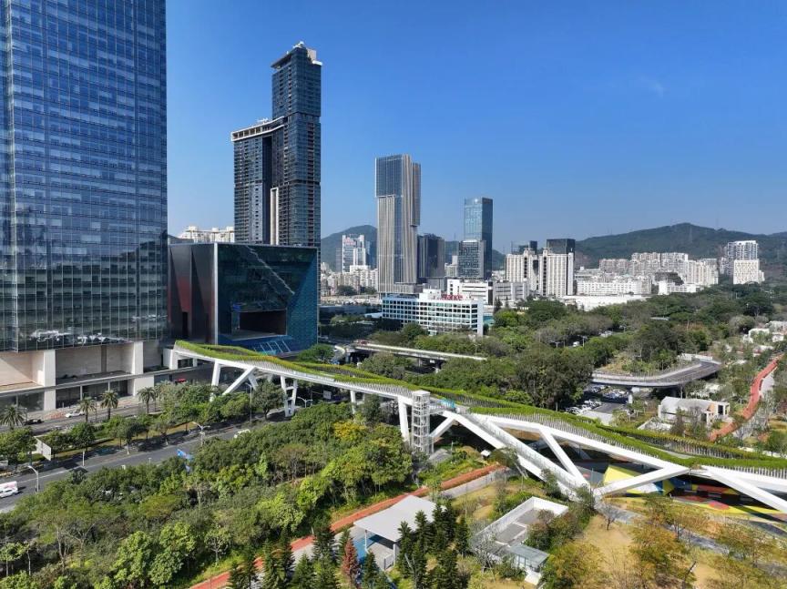 在深圳福田区,景观廊桥将莲花山、笔架山两座公园与深业上城商场连接,市民可以方便地逛完公园再逛街。