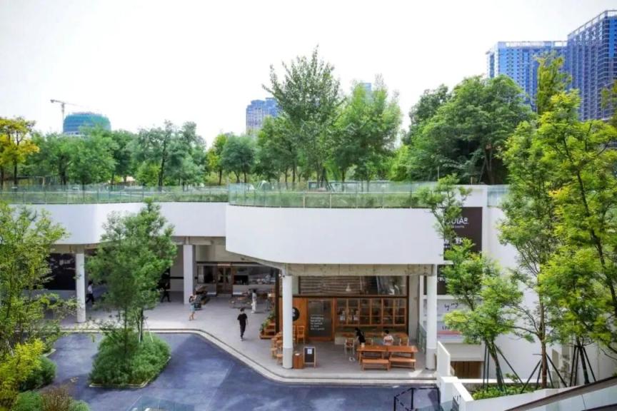 公园建筑的更新,并不局限于茶楼、书吧、咖啡厅等小体量业态,商业综合体也可以“藏”进公园。